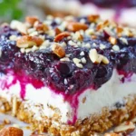 A delightful no-bake dessert combining sweet blueberries with a creamy cheese layer and a crunchy pretzel crust.