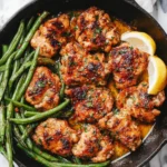 A comforting and quick weeknight dinner featuring tender chicken thighs glazed in garlic butter sauce and vibrant green beans.